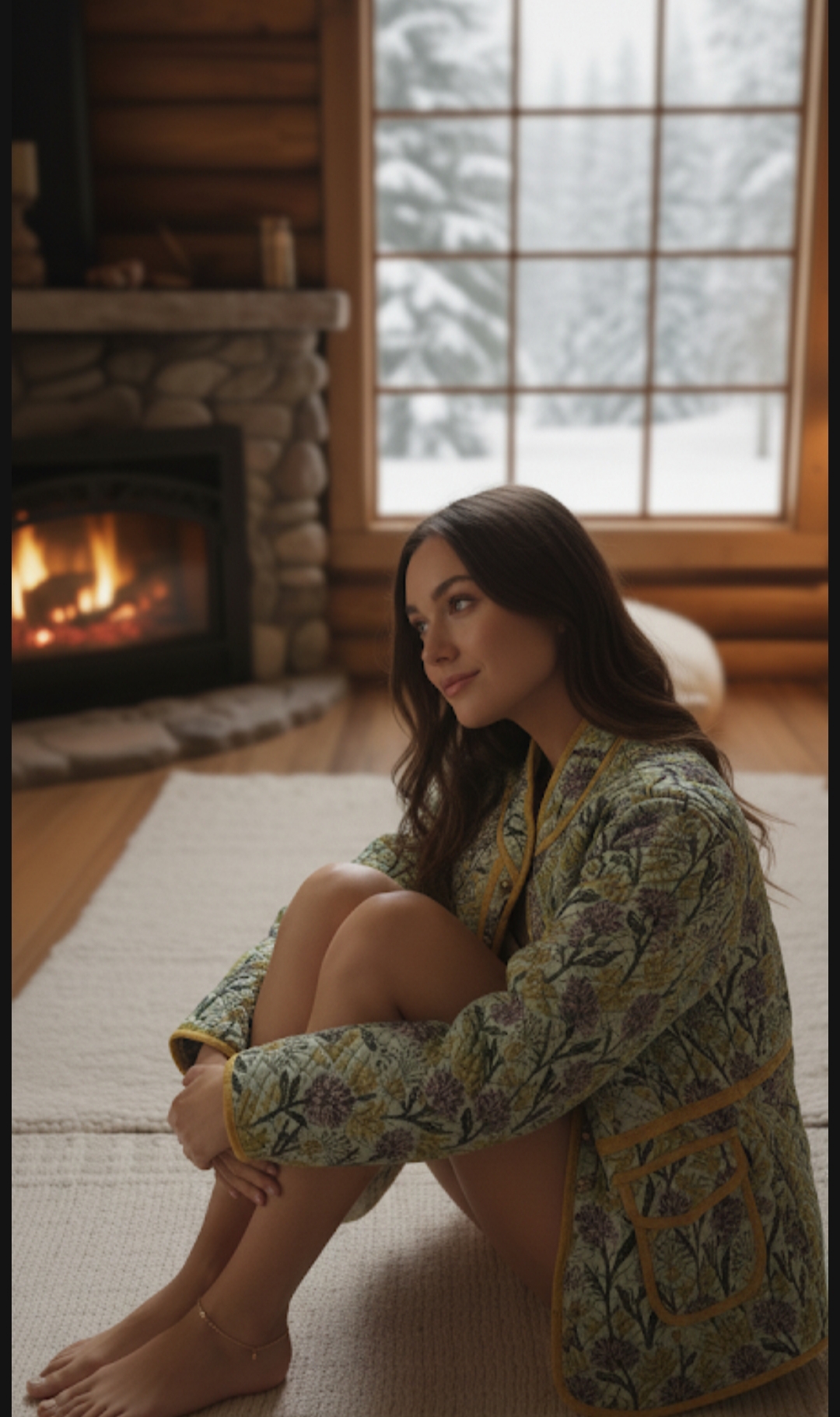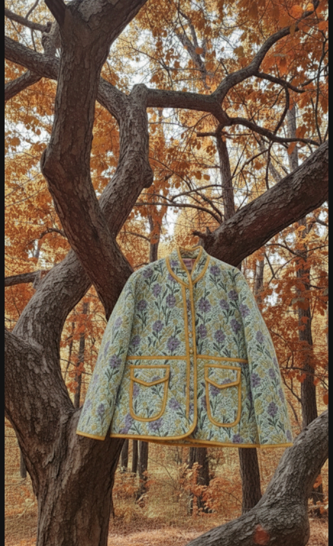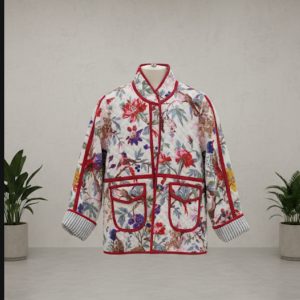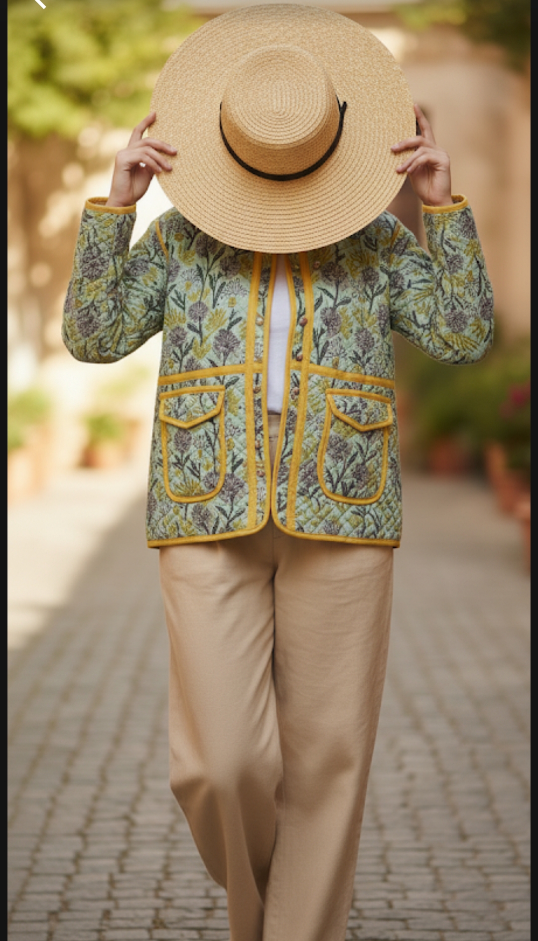 Chaqueta corta de algodón reversible ligera, de color verde agua con dibujos de flores en tonos pasteles y bordes de color mostaza. Consta de dos bolsillos en el anverso y el reverso es de rayas de color blanco y verde. Diseñadas en exclusividad por Coco India. Exclusivas, hechas y confeccionadas bajo nuestras instrucciones en medidas y elección de los estampados.