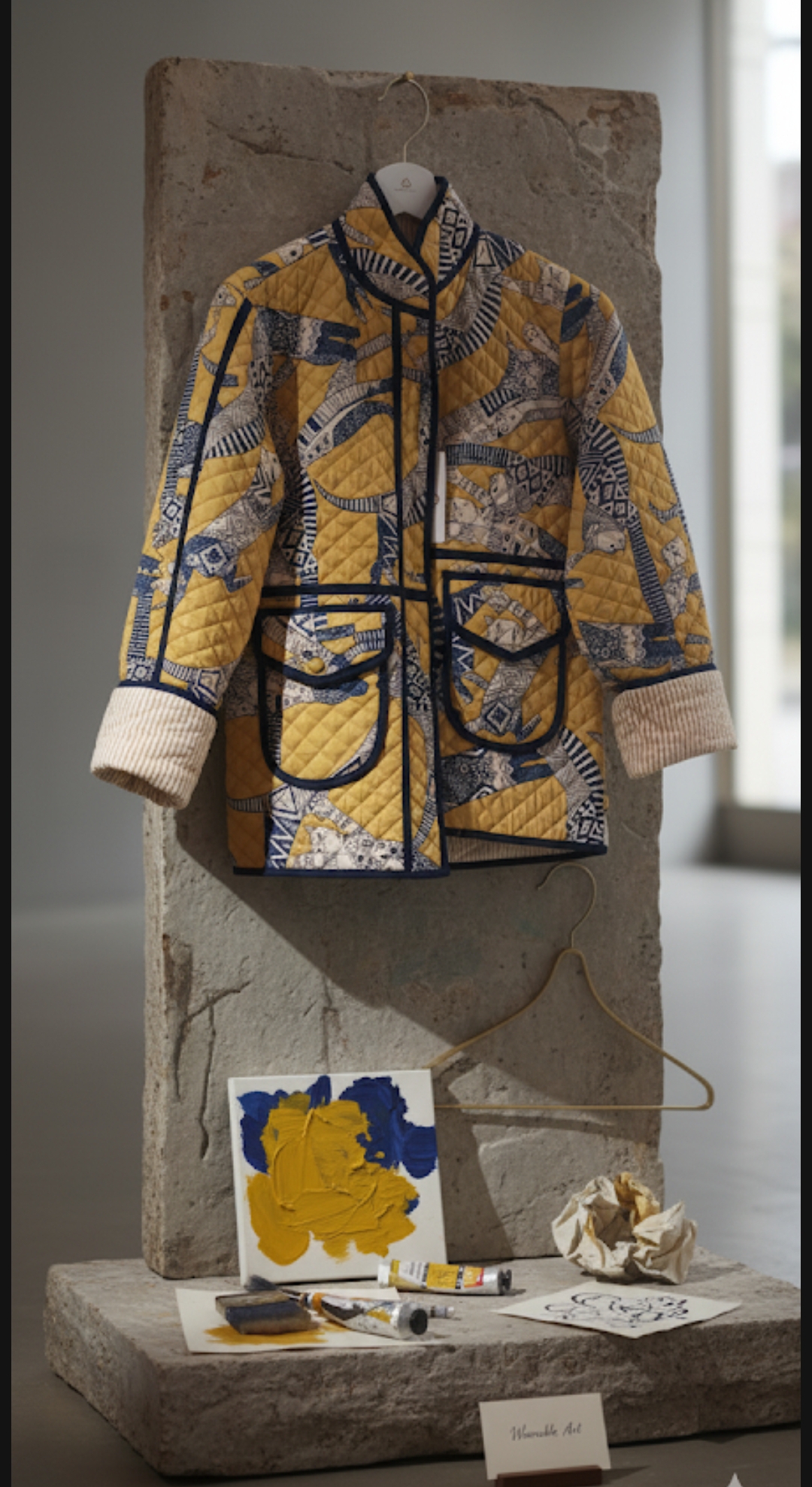 CHAQUETA CORTA ALGODÓN, AMARILLA CON ANIMALES EN AZUL MARINO
