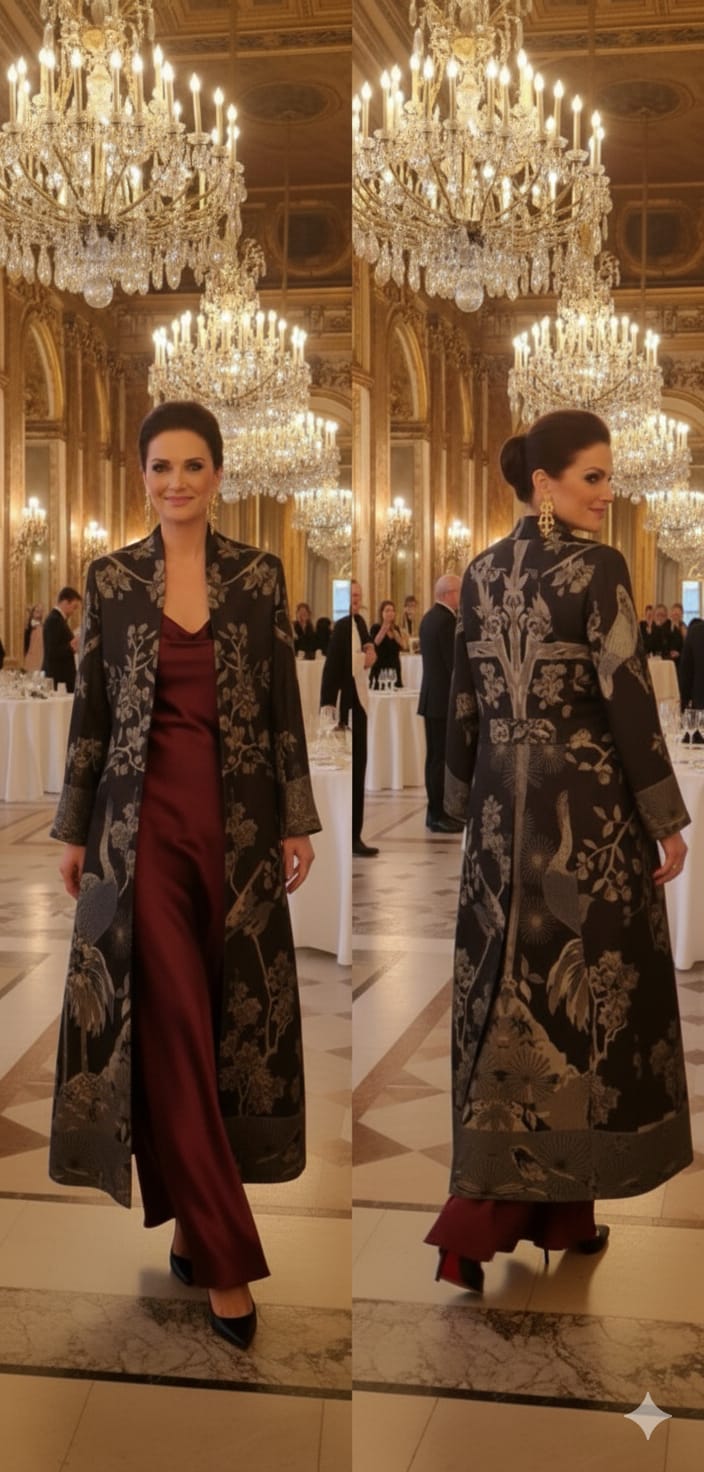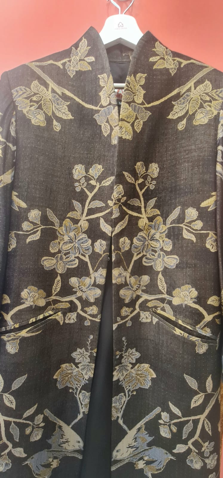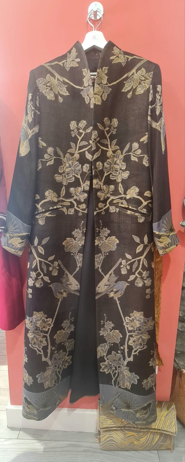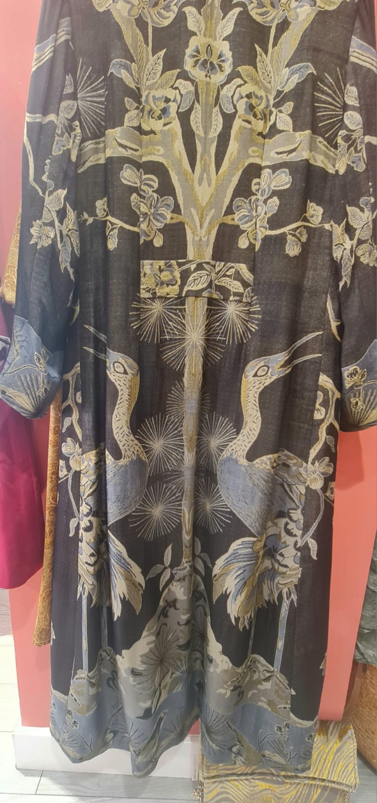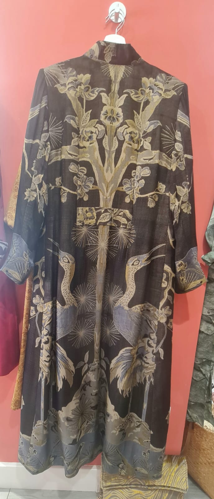 Abrigo en color negro de lana cachemira con seda con cuello alto, largo 135 cm con dibujos de flamencos, pájaros y arboles en tonos dorados . Está forrado en su interior, cierre de corchetes, tiene dos bolsillos delanteros.