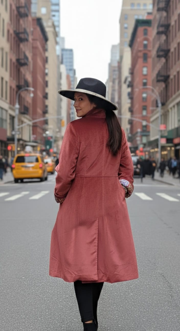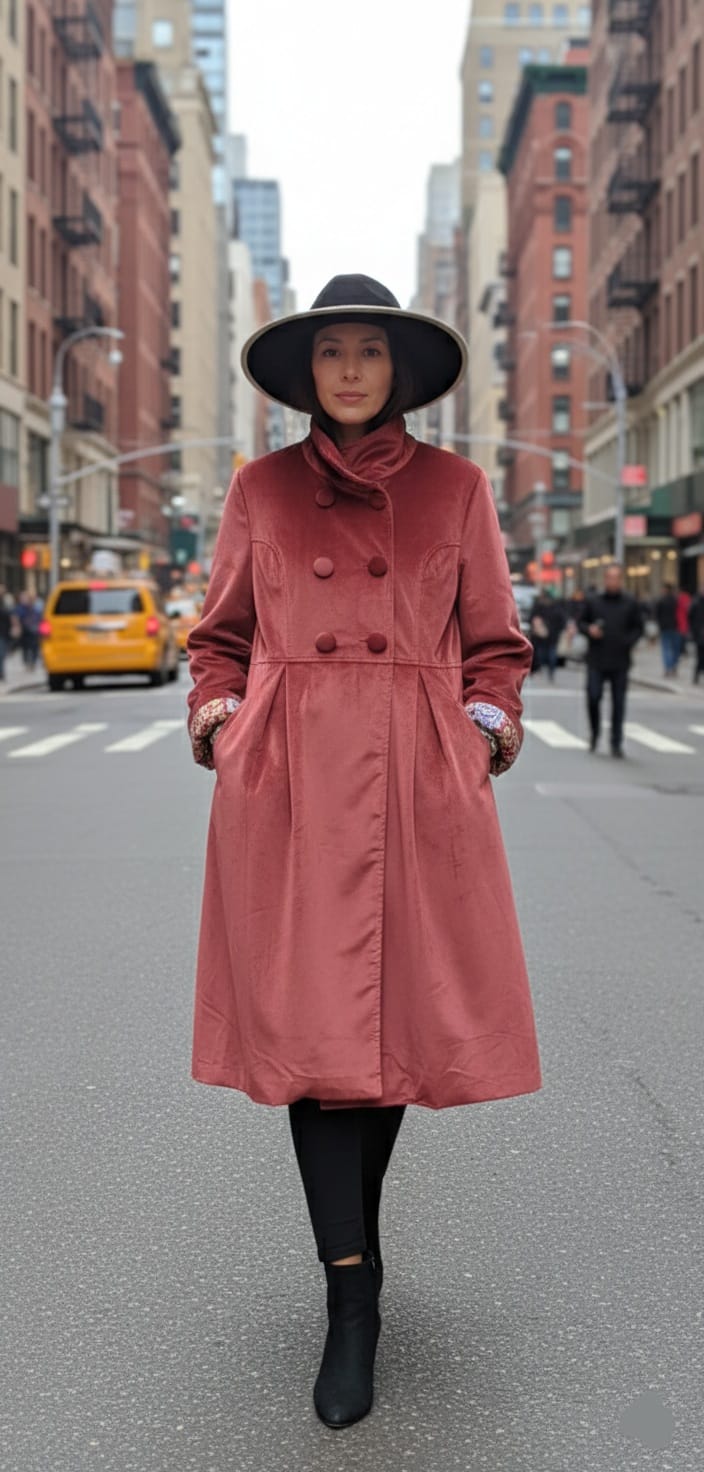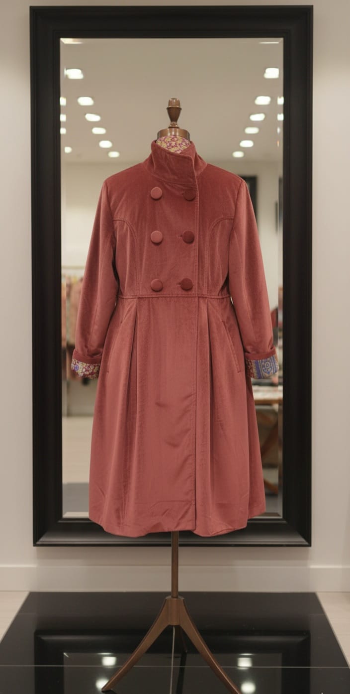 Abrigo terciopelo reversible abotonado de forma cruzada con botones forrados del mismo terciopelo. En su interior el forro es de seda saree en los mismo tonos del abrigo.