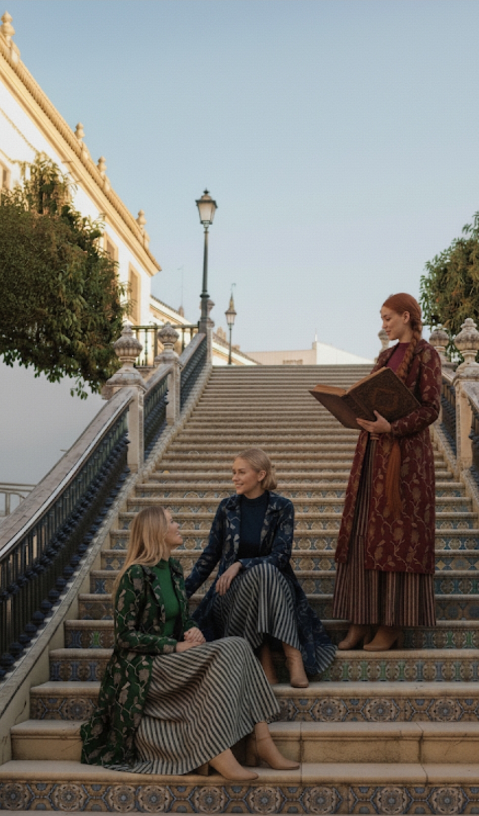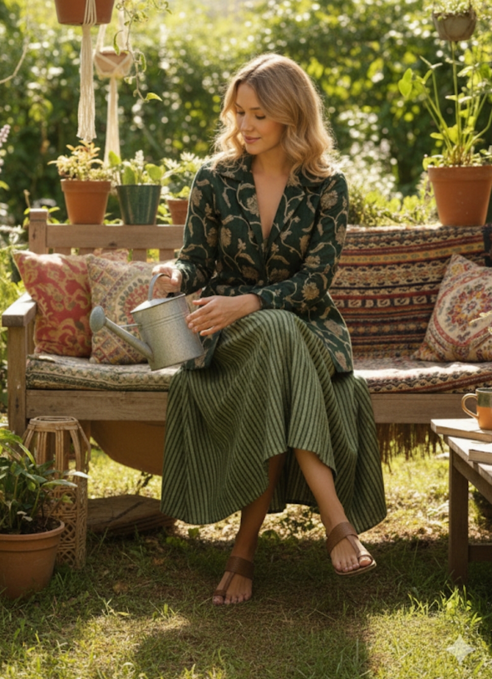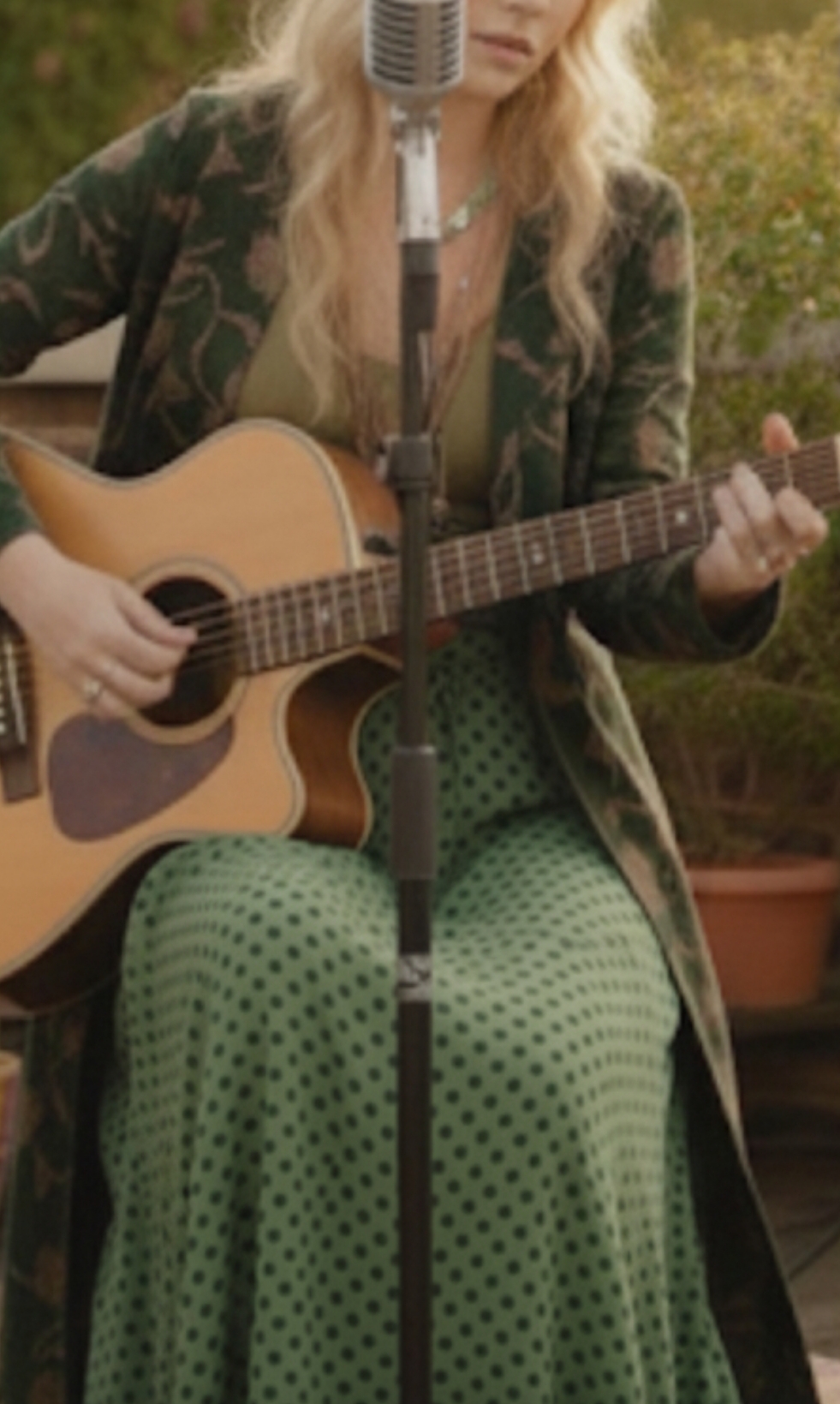 Abrigo ligero midi, con diseño distintivo. Color verde, tiene solapas, el tejido es como un brocado con patrón floral en dorado. Recuerda a prendas de inspiración india (Kurta). El largo que tiene esta pieza, es muy versátil, dado que combina a la perfección con un estilo informal, como un estilo festivo, dado que el tejido brocado no necesita mucho más.