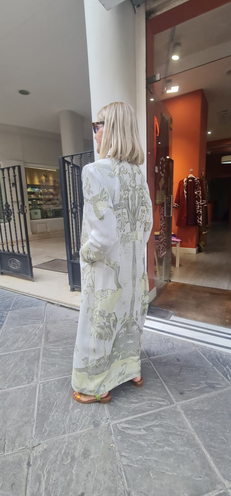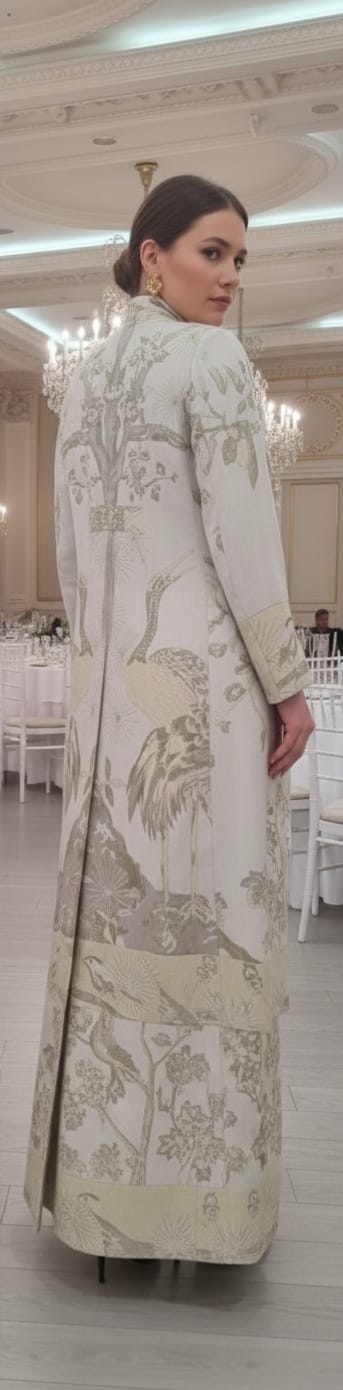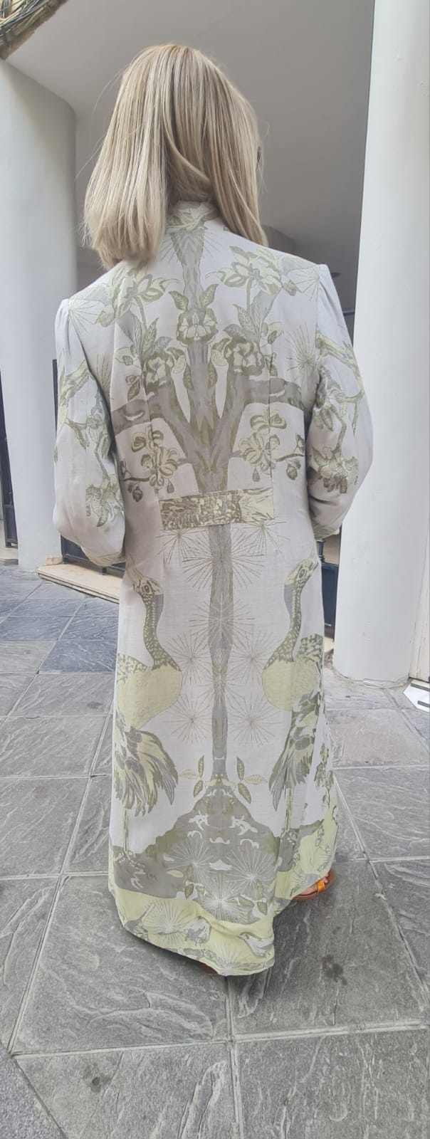 Abrigo en color blanco roto de lana cachemira con seda con cuello alto sin solapa largo 135 cm con dibujos de flamencos, pájaros y arboles en tonos verde manzana. Está forrado en su interior, con cierre de corchetes ,tiene dos bolsillos delanteros.