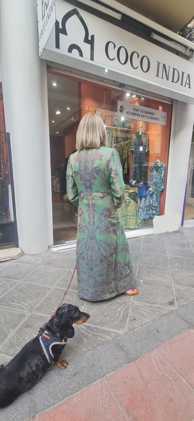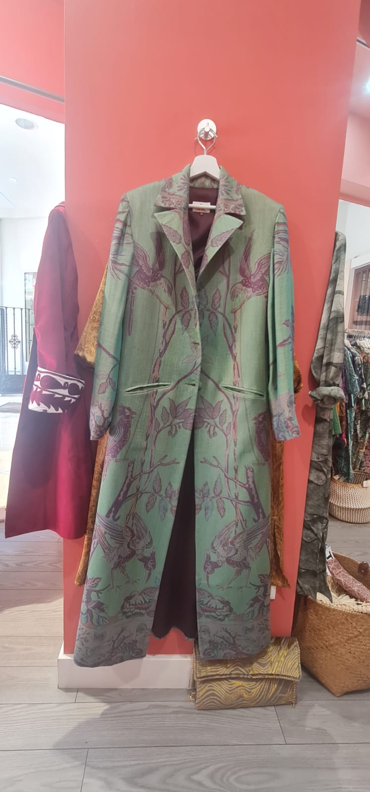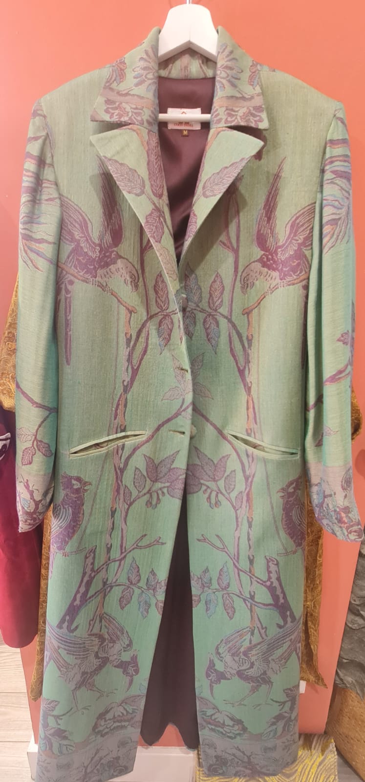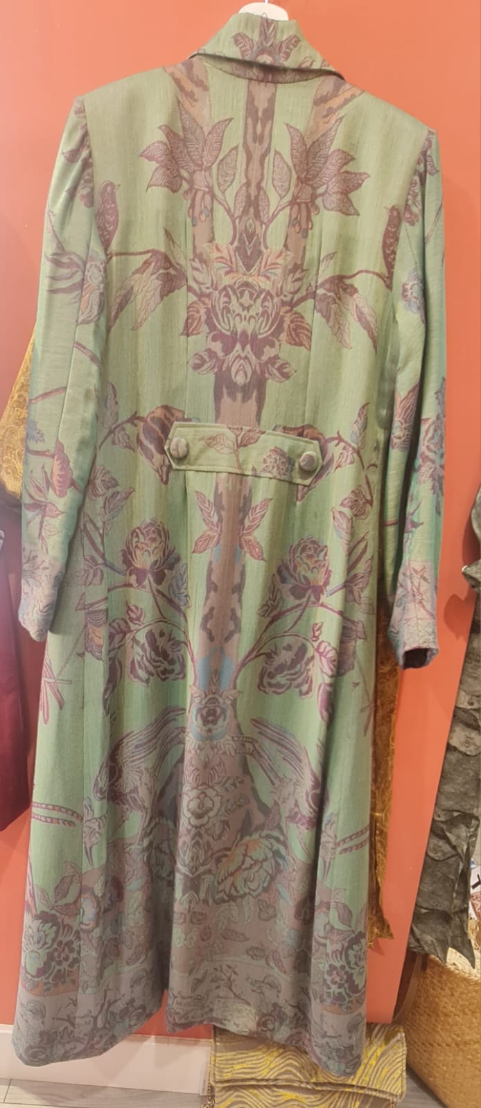 Abrigo en color verde agua de lana cachemira con seda, con solapa, largo 135 cm con dibujos de flamencos, pájaros y arboles en tonos rosas, buganvilla . Está forrado en su interior, tiene dos bolsillos delanteros.