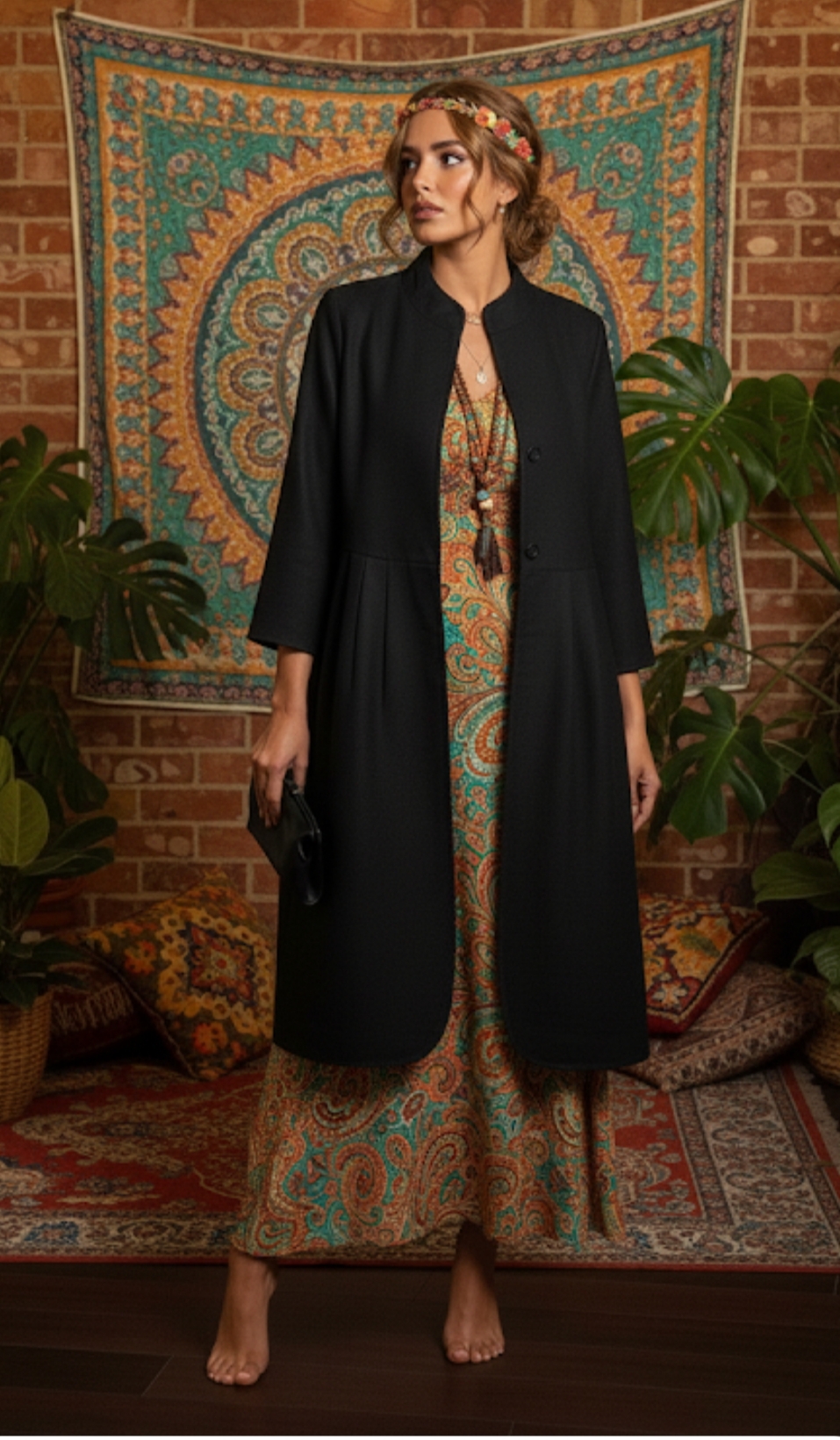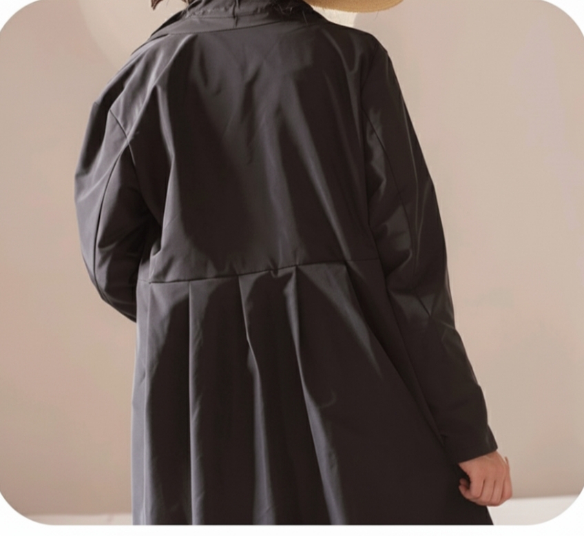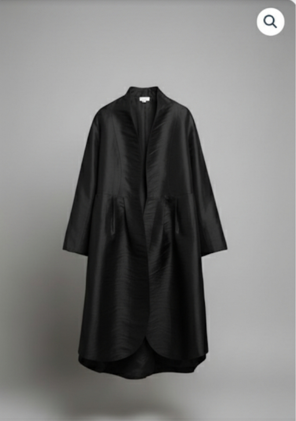 Presentamos abrigo de seda en negro, de tablas, corte amplio, ligeramente acampanado, cuello alzado, dos bolsillos laterales, mangas largas. Estilo minimalista, elegante.