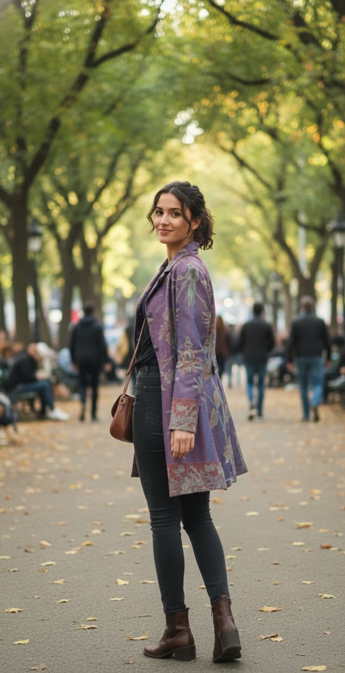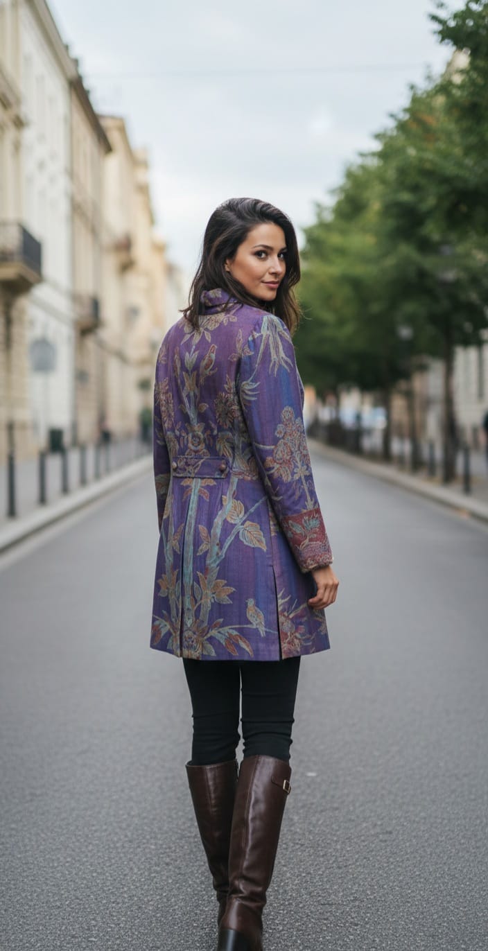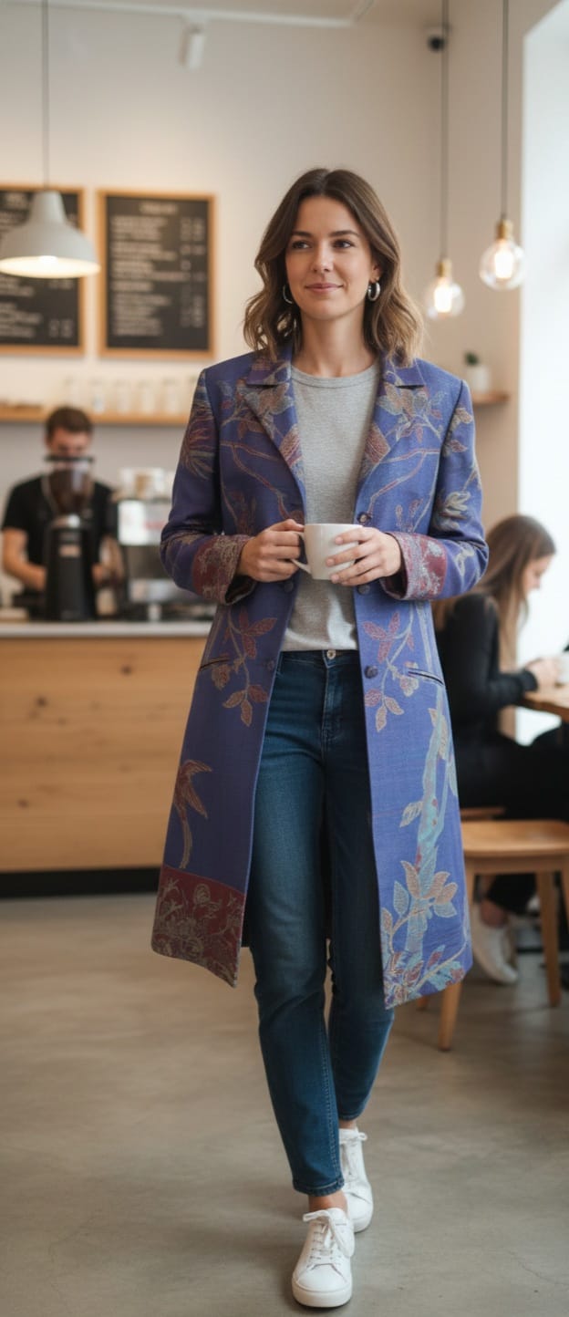 Abrigo en color azulón, de lana cachemira con seda, con solapa largo 100 cm con dibujos de loros, pájaros y arboles en tonos burdeos, buganvillas y azules . Está forrado en su interior, tiene dos bolsillos delanteros.