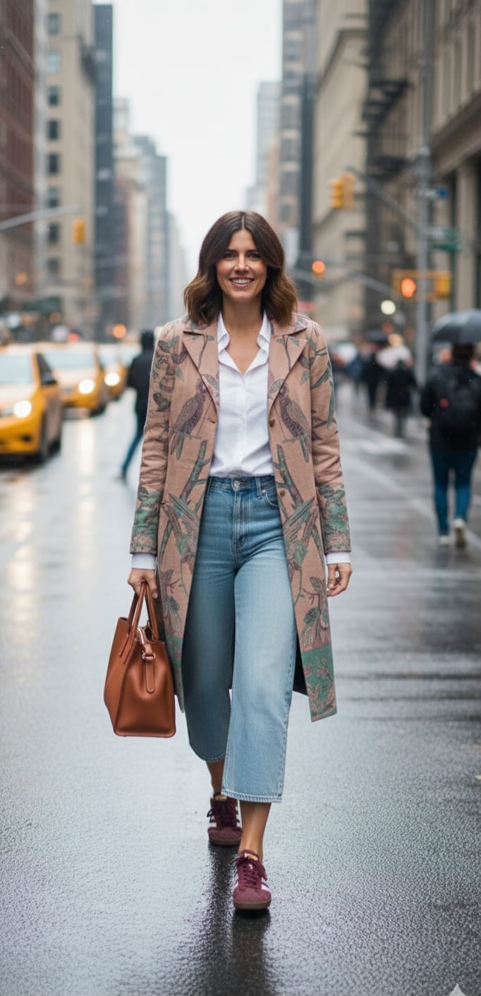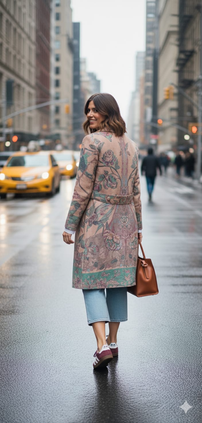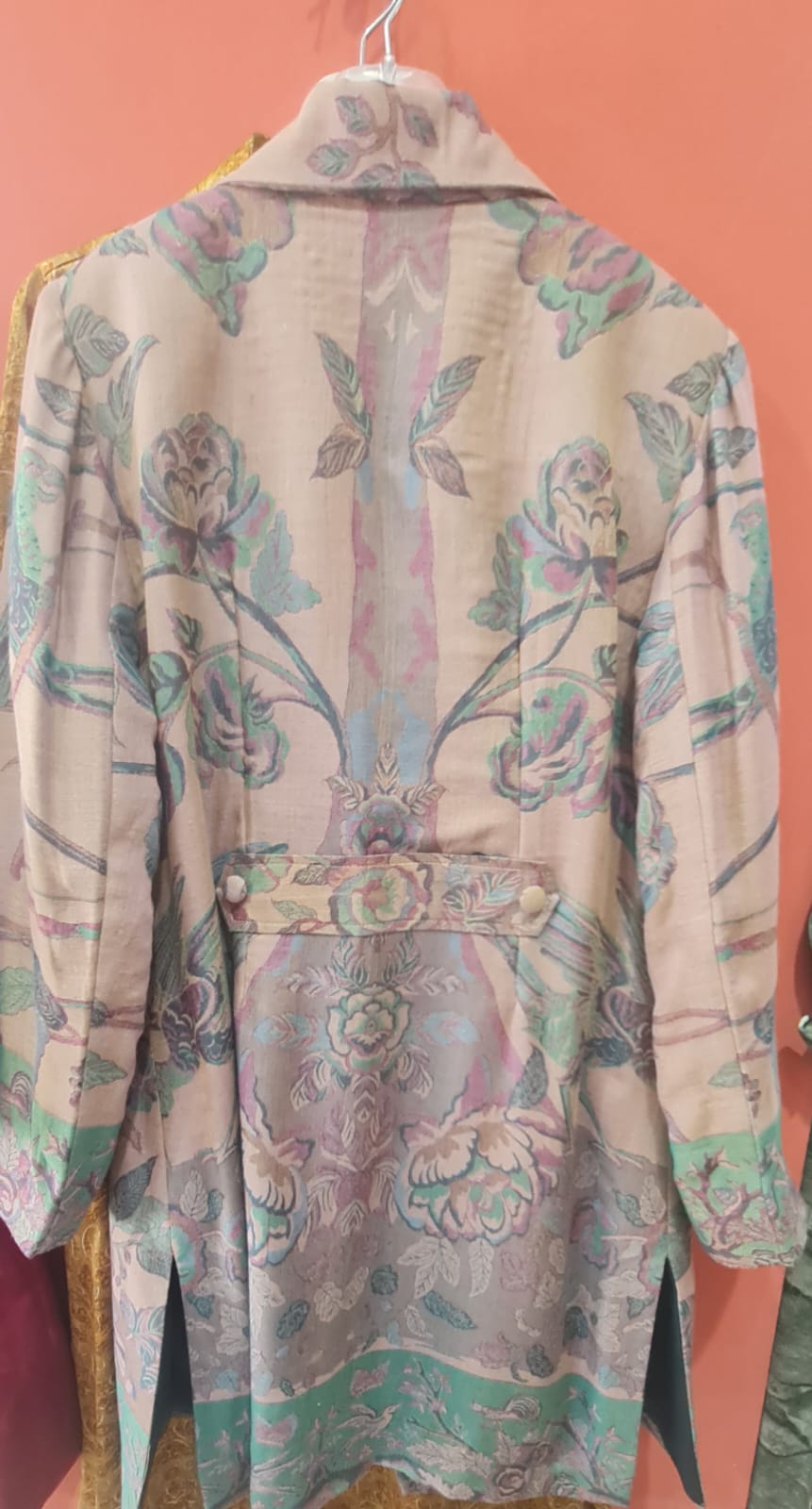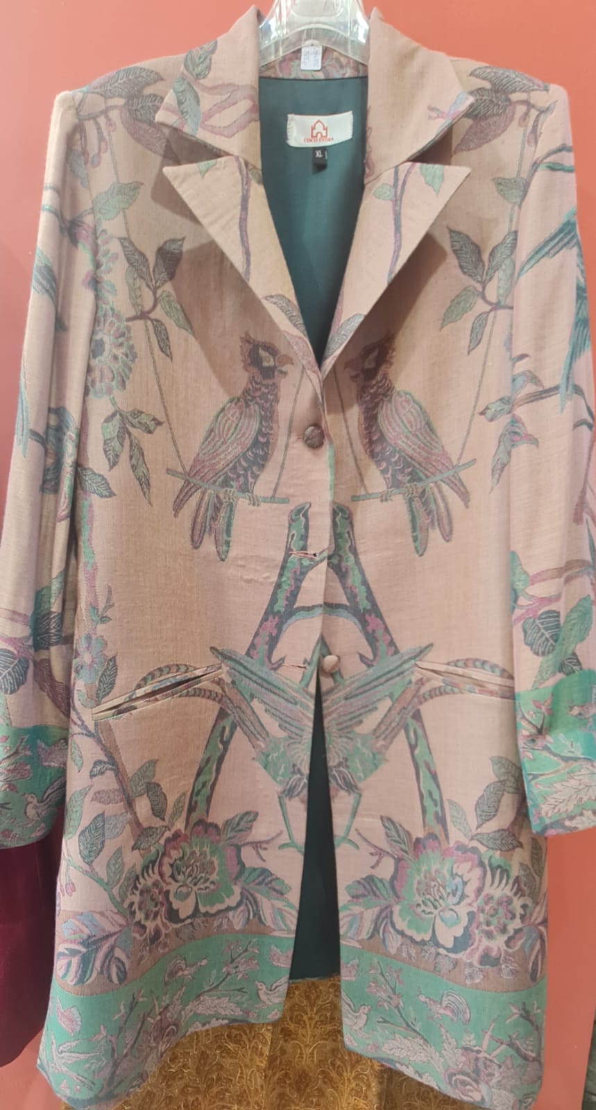 Abrigo en color rosa palo de lana cachemira con seda, con solapa largo 100 cm con dibujos de loros, pájaros y arboles en tonos rosas, buganvillas y verdes . Está forrado en su interior, tiene dos bolsillos delanteros.