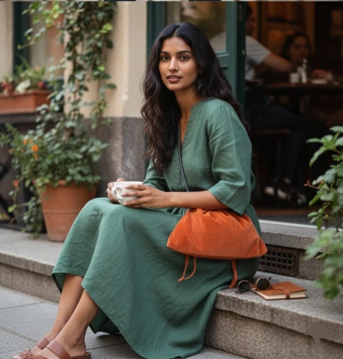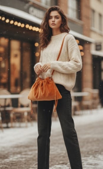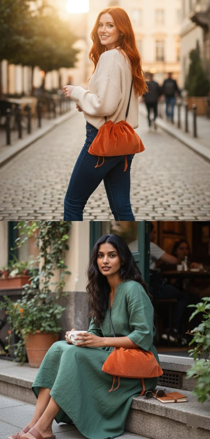 Es un bolso tipo saquito confeccionado en terciopelo. El material le da una textura suave y aterciopelada, con un aire cálido y elegante, perfecto para looks casuales con un toque sofisticado.