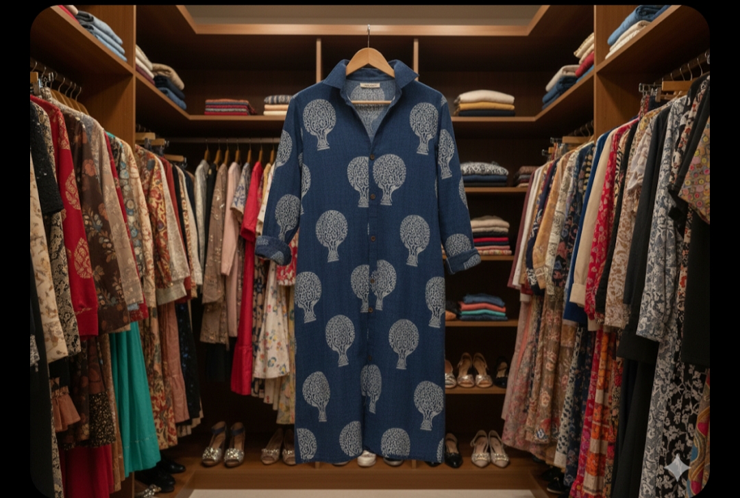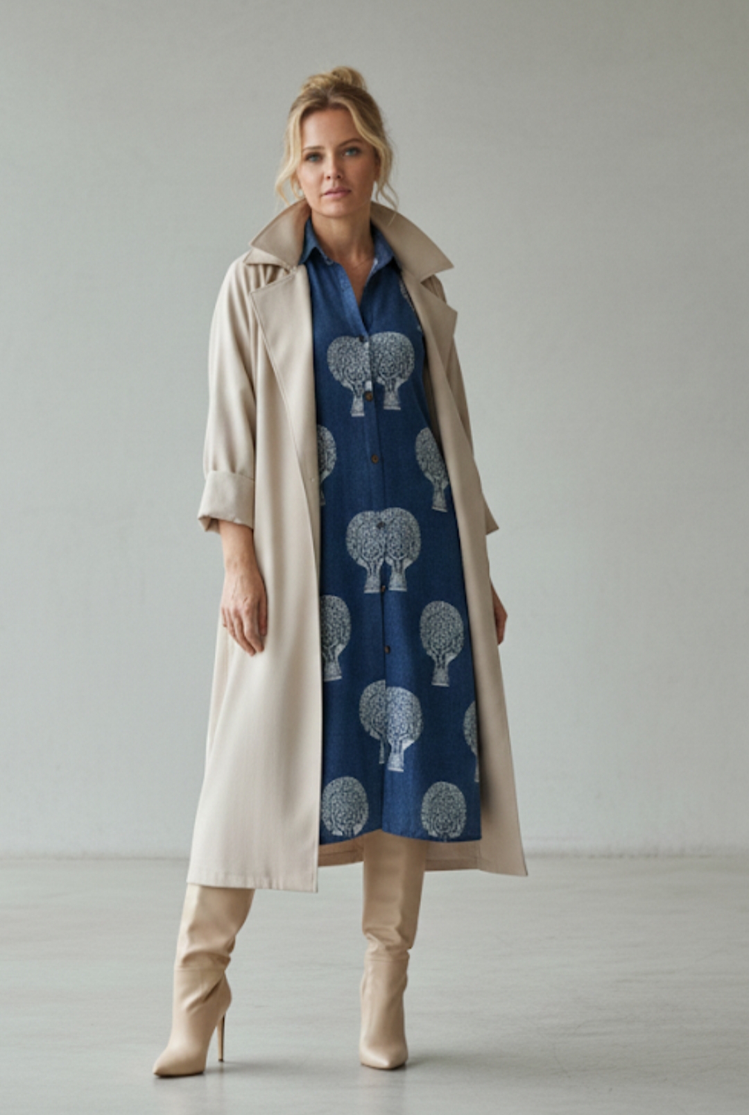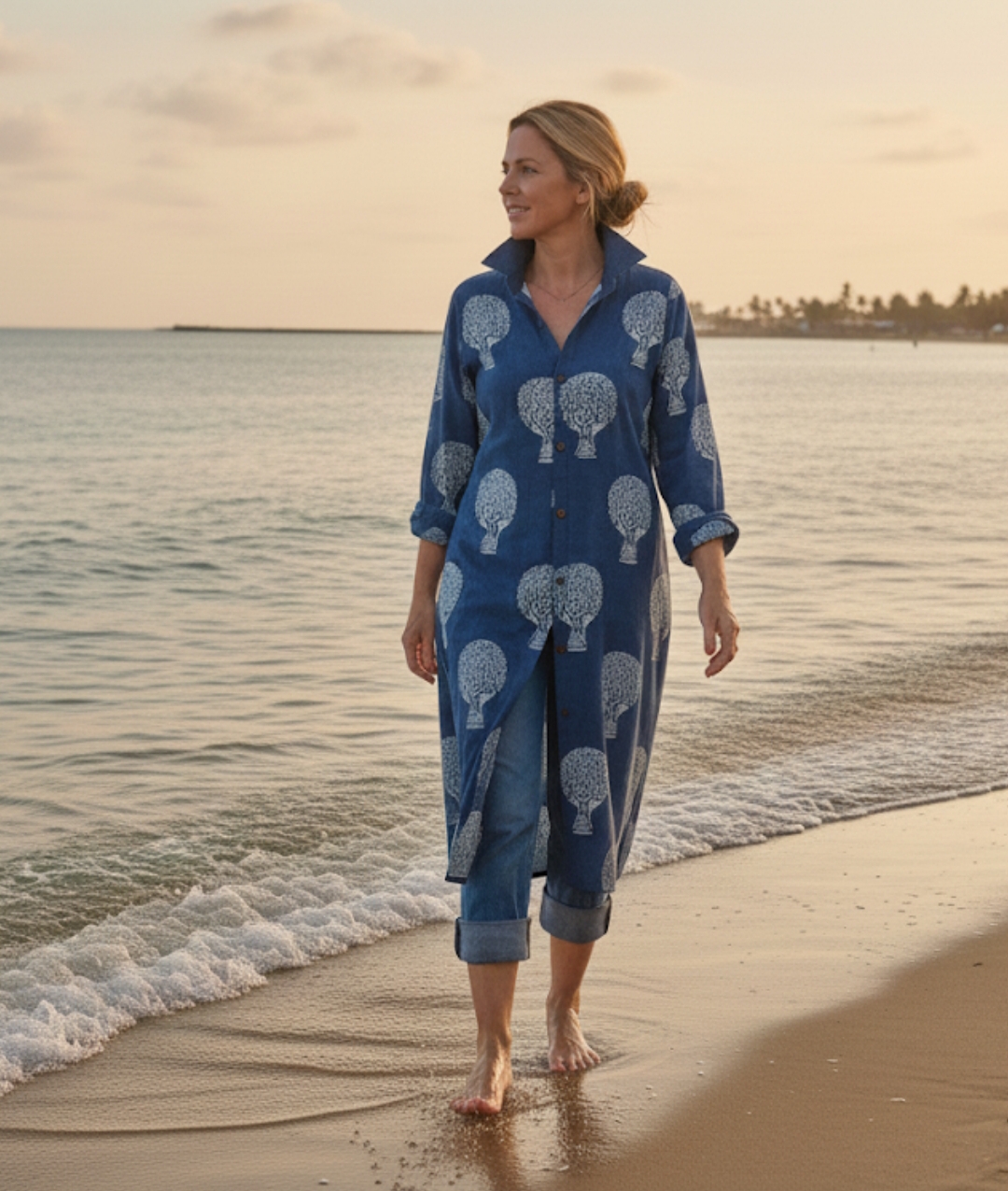 Camisero de algodón, con fondo azul marino, con dibujos de arboles en beige, dibujos de la cultura india, le gusta imprimir en sus vestimentas, manga larga, abotonado hasta abajo, con botones de madera y su rajita lateral para un mejor movimiento y más cómodo.