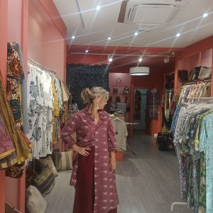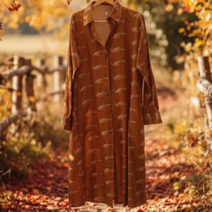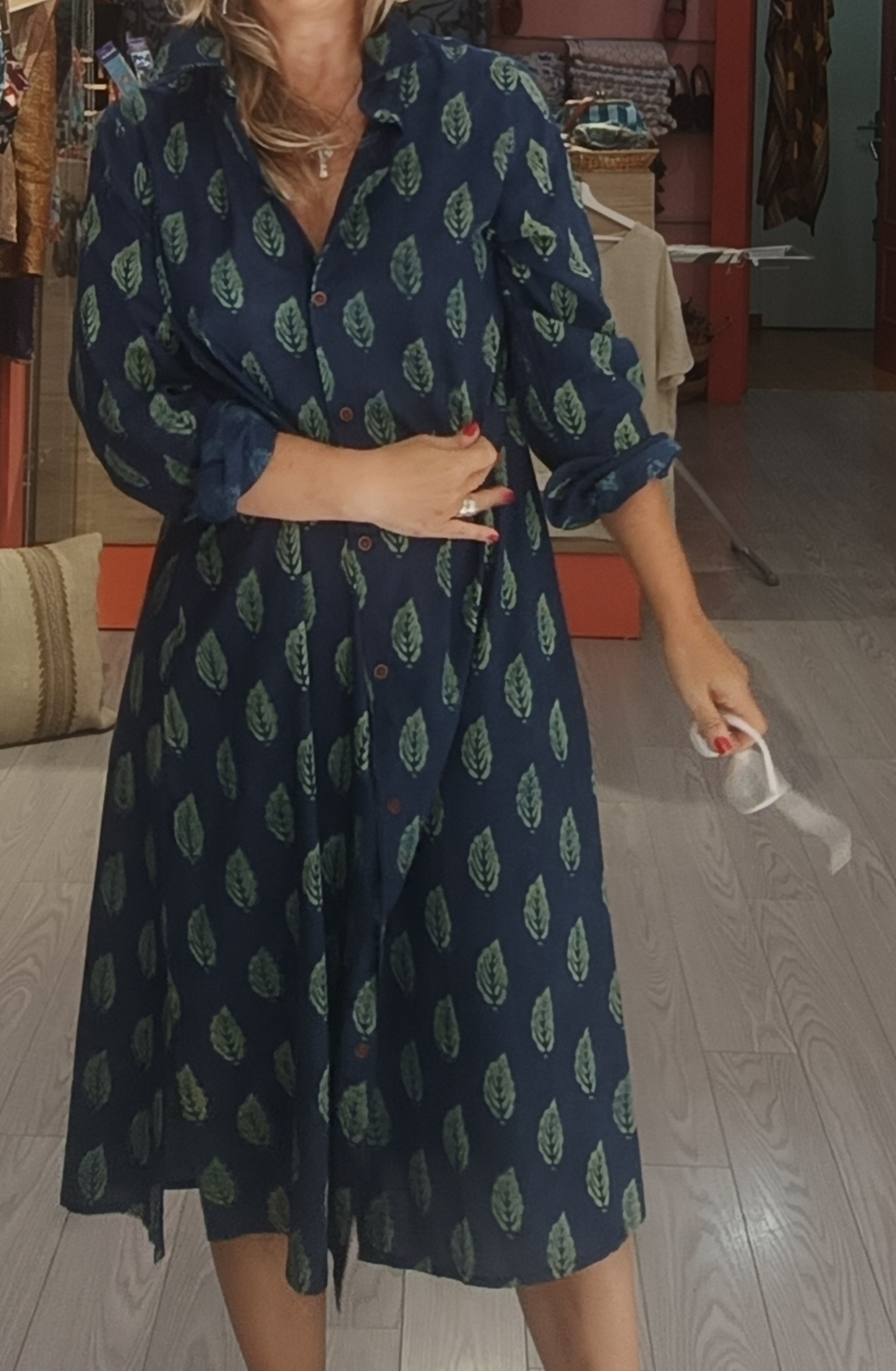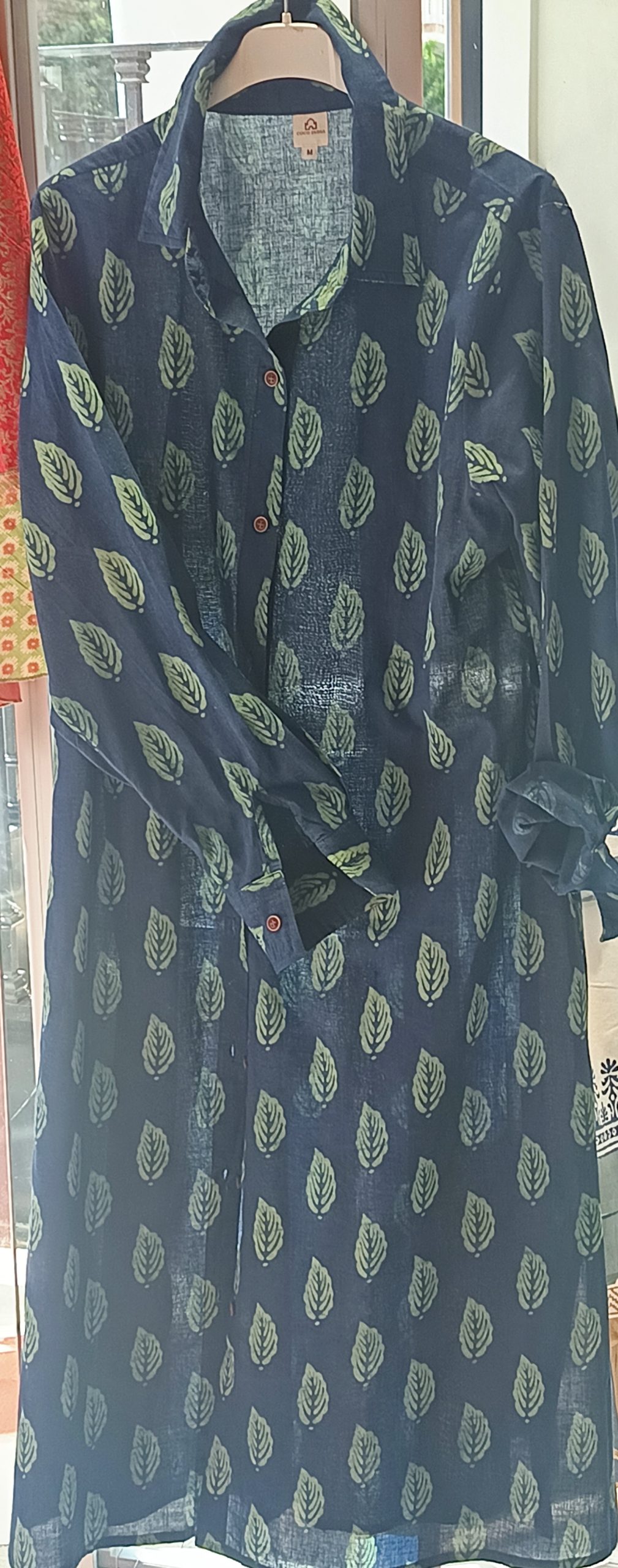 Camisero de algodón, con fondo azul marino, con dibujos de flores en verde, dibujos de la cultura india, le gusta imprimir en sus vestimentas, manga larga, abotonado hasta abajo, con botones de madera y su rajita lateral para un mejor movimiento y más cómodo.