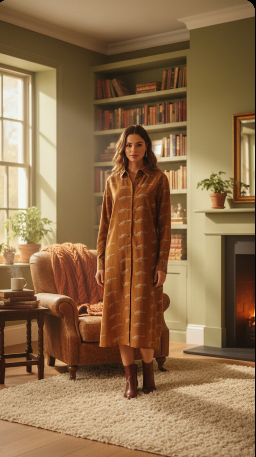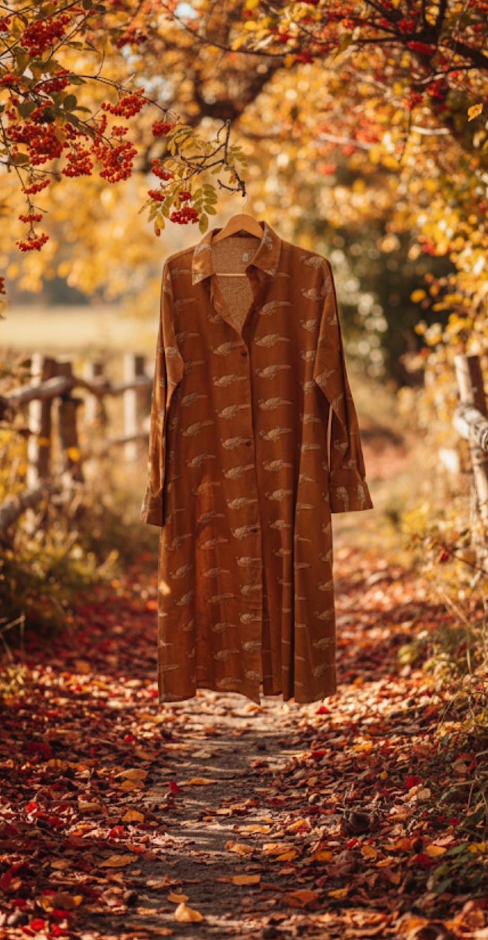 Camisero de algodón, con fondo mostaza, con dibujos de loros en en el mismo color, dibujos de la cultura india, le gusta imprimir en sus vestimentas, manga larga, abotonado hasta abajo, con botones de madera y su rajita lateral para un mejor movimiento y más cómodo.