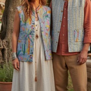 Camisero en seda satinada, en azul con dibujos étnicos, abotonado hasta abajo, con botones de madera y su rajita lateral, ideal para un movimiento mejor y más cómodo.
