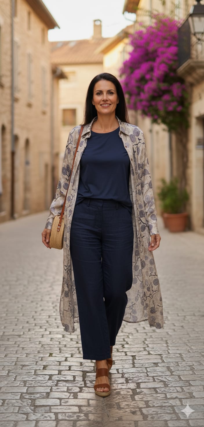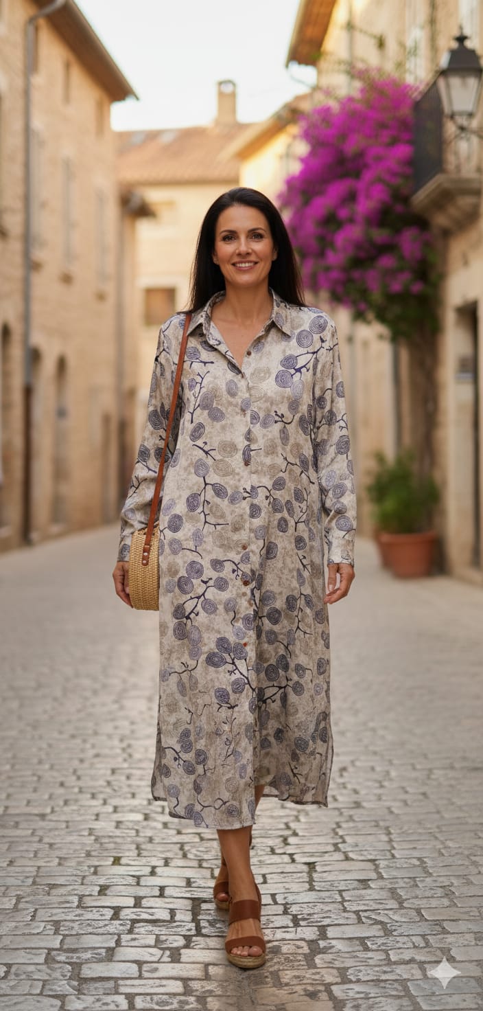 Camisero en seda satinada, con fondo azul y con dibujos de ramitas de árboles del mismo tono, abotonado hasta abajo, con botones de madera y su rajita lateral, ideal para un movimiento mejor y más cómodo.