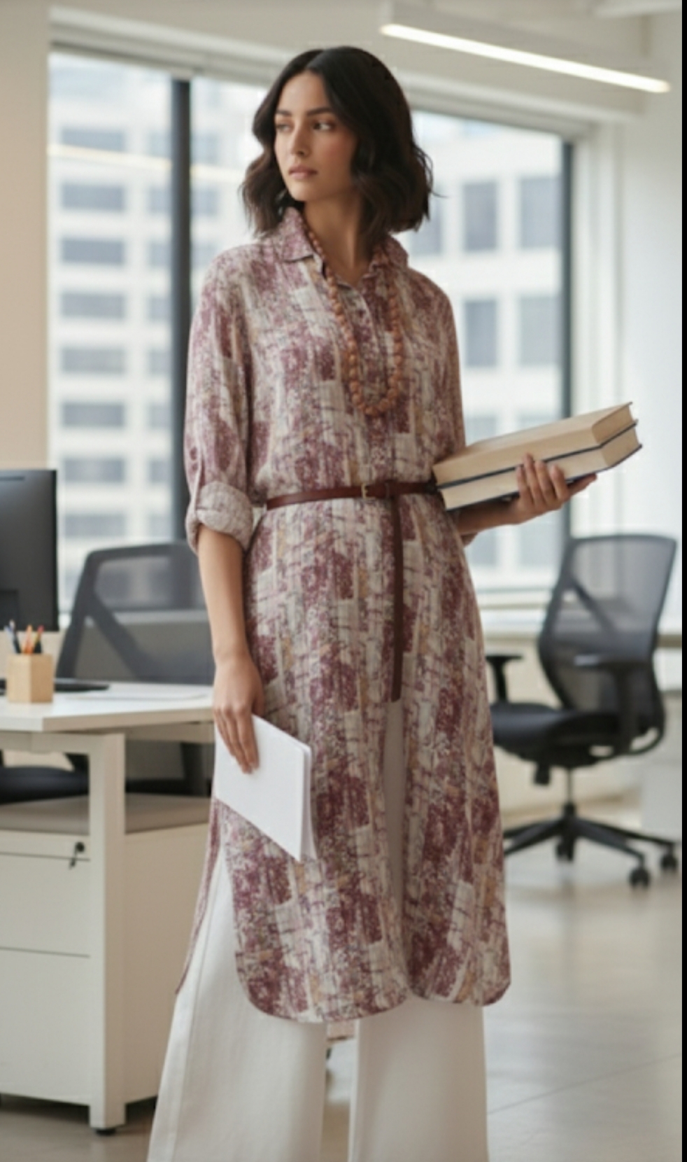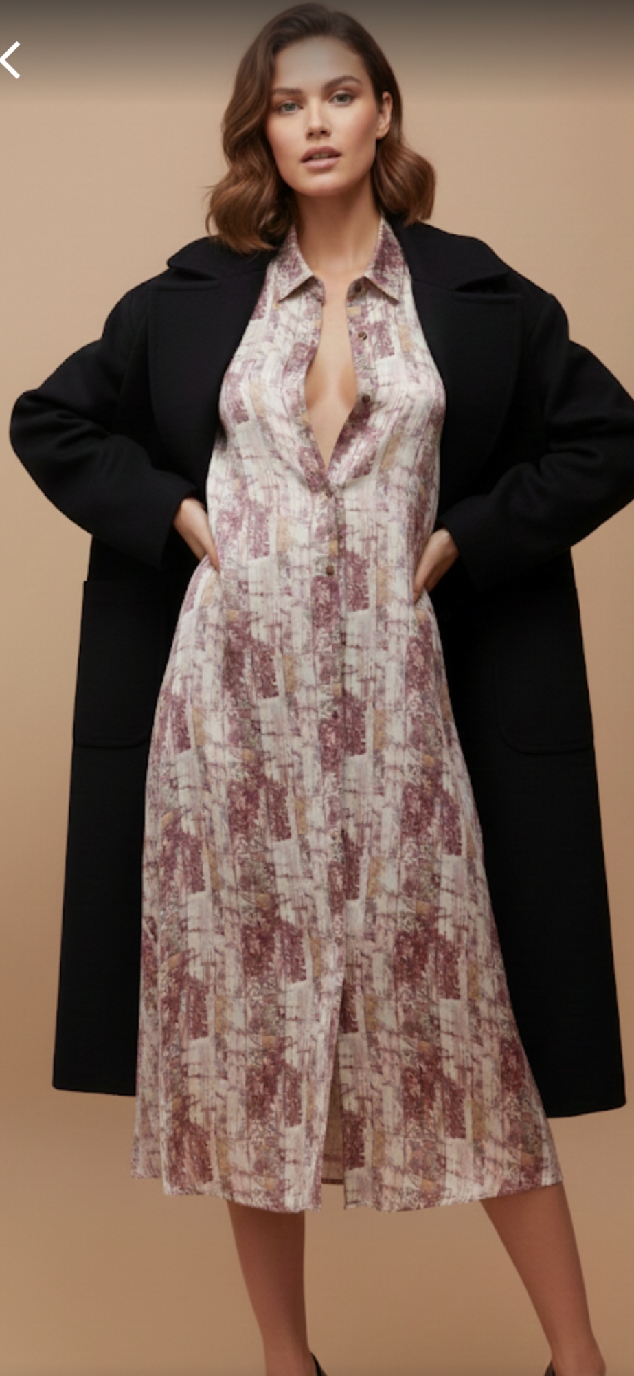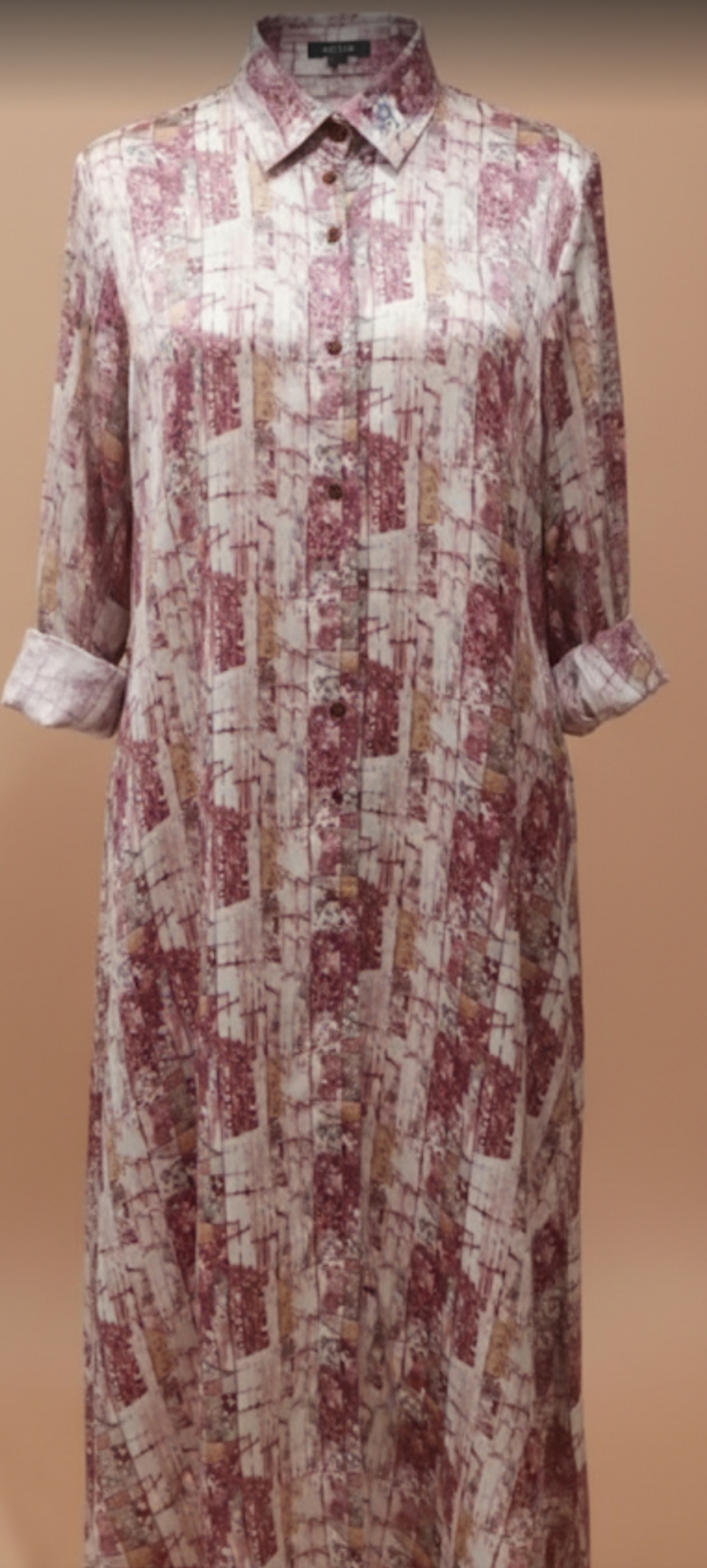 Camisero en seda satinada, en en burdeos simulando cuadritos, abotonado hasta abajo, con botones de madera y su rajita lateral, ideal para un movimiento mejor y más cómodo.