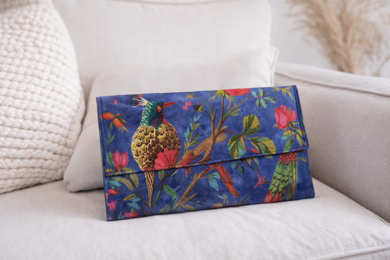 Cartera de mano de terciopelo en color azul con dibujos de pájaros y flores. El interior es de color negro con un bolsillo. La puedes vestir en la mano o con una cadena para poder colgarse al hombro en tonos dorado. La medida es de 35 cm de largo por 20cm de ancho.