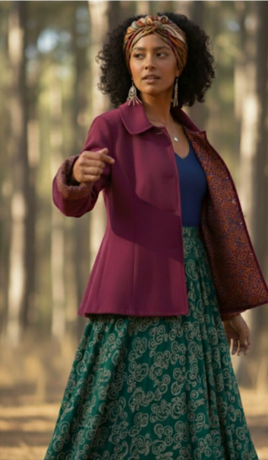 Chaqueta de corte corto, con un estilo que recuerda a una capa, se ensanchan desde los hombros ofreciendo una silueta acampanada.