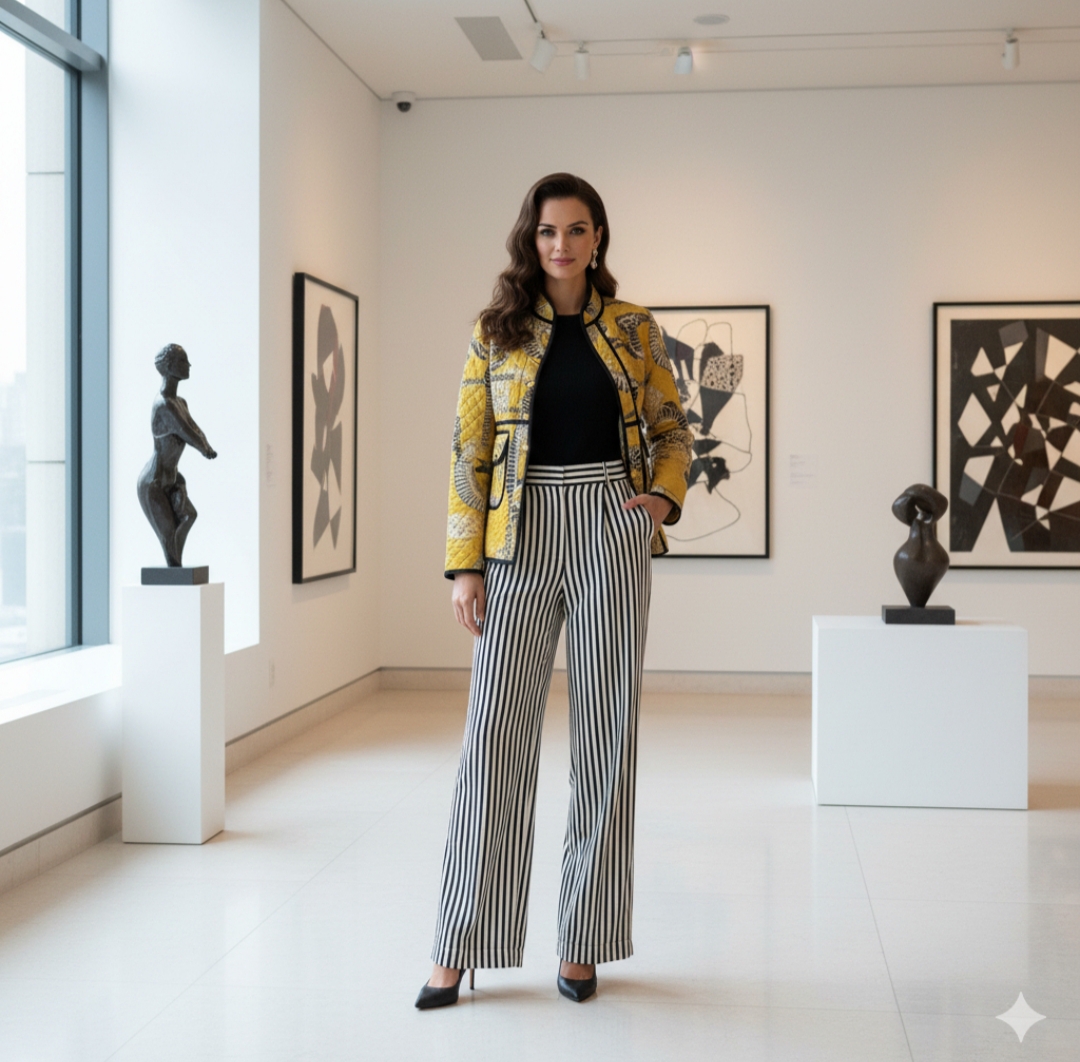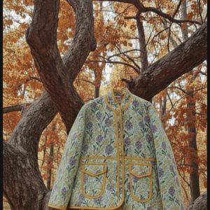Chaqueta corta de algodón reversible ligera, de color amarillo/ mostaza con dibujos y bordes de color azul marino. Consta de dos bolsillos en el anverso y el reverso es de rayas de color amarillo y blanco. Diseñadas en exclusividad por Coco India. Exclusivas, hechas y confeccionadas bajo nuestras instrucciones en medidas y elección de los estampados.