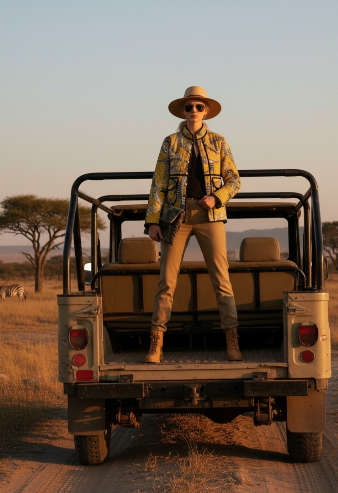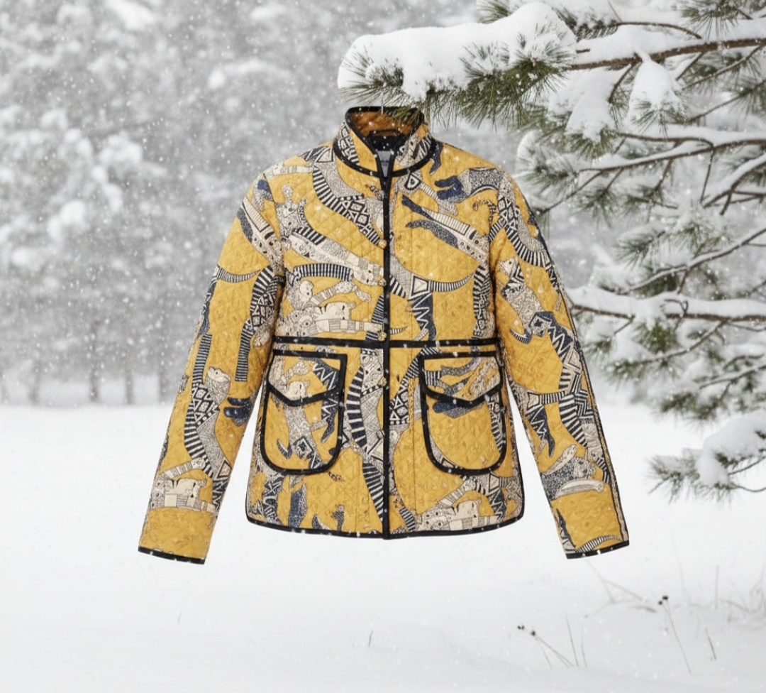 CHAQUETA CORTA ALGODÓN, AMARILLA CON ANIMALES EN AZUL MARINO