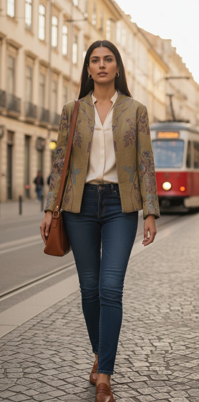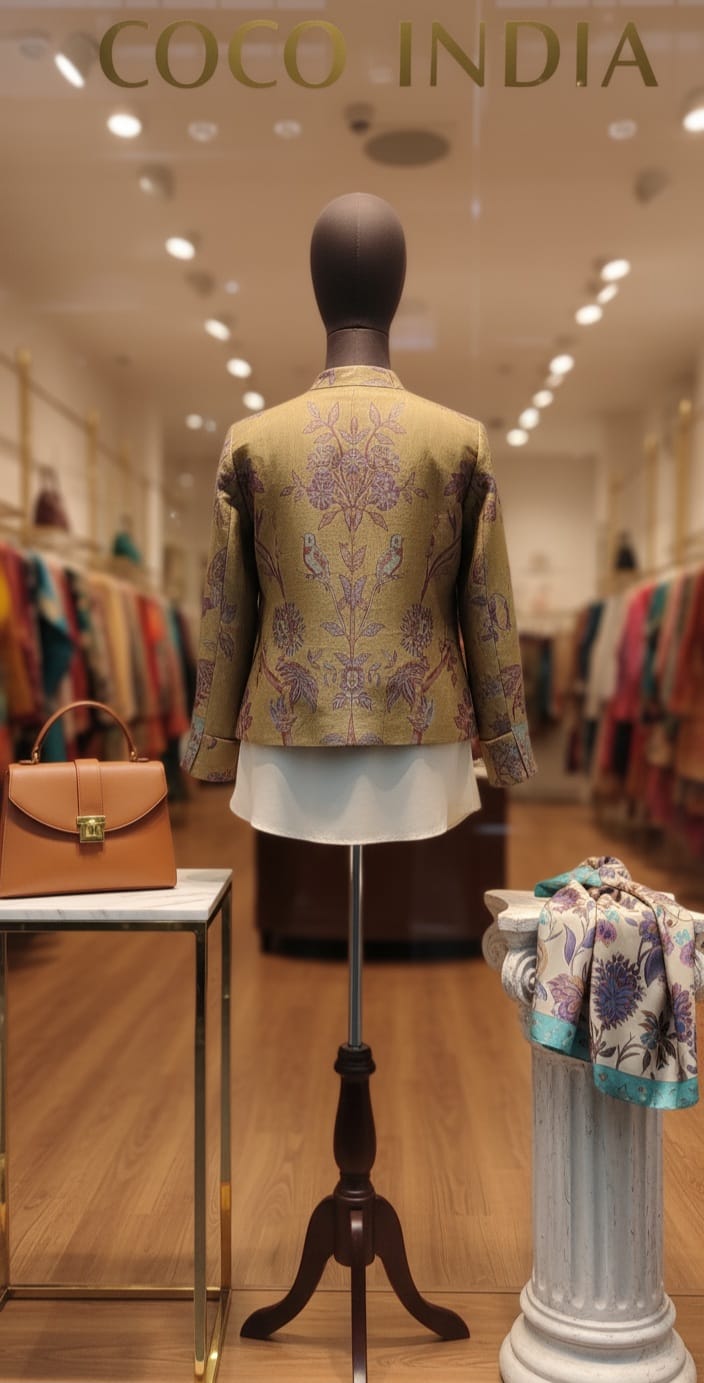 Chaqueta en color dorado/tabaco de lana cachemira con seda con cuello alto con solapa largo 60 cm con dibujos de pájaros y flores en tonos burdeos, azules y beige. Está forrado en su interior, con cierre de corchetes.