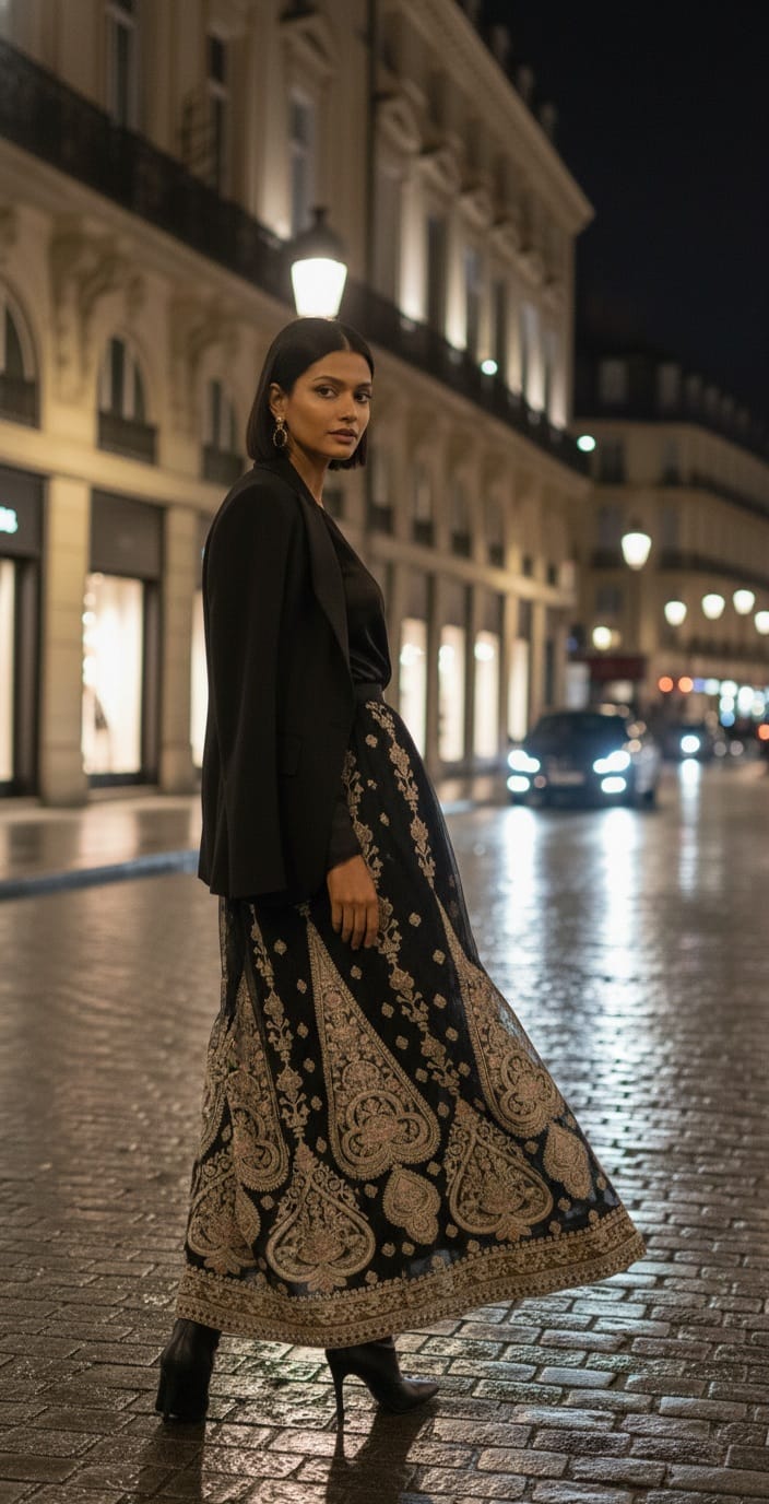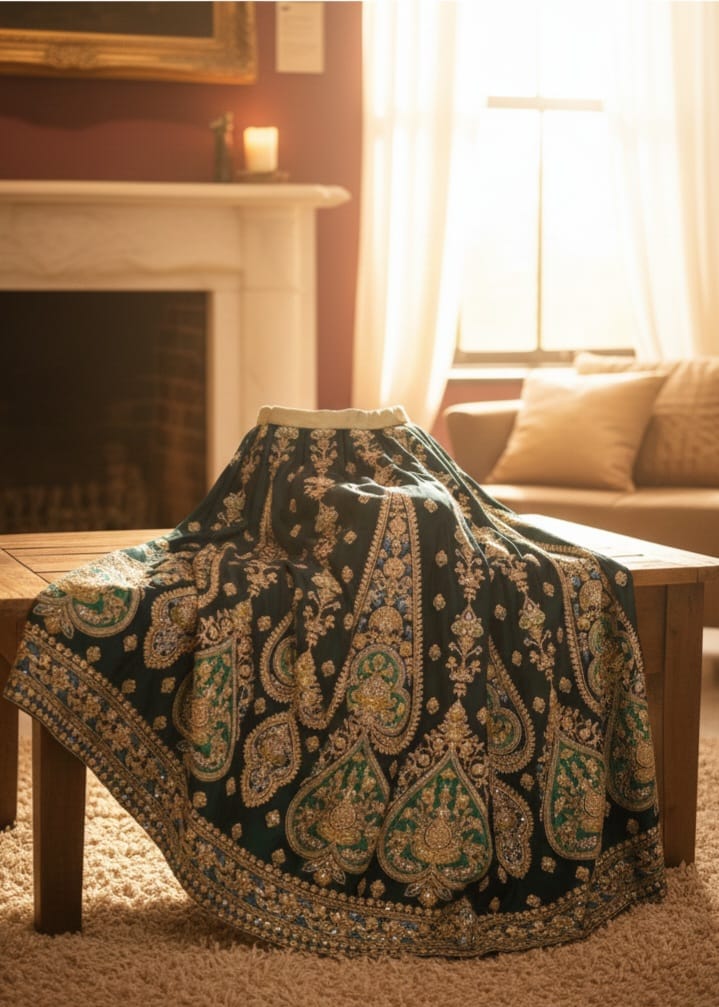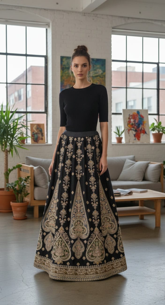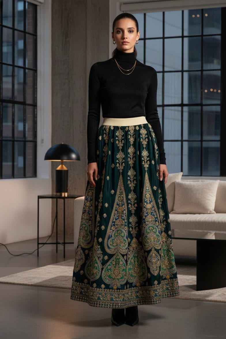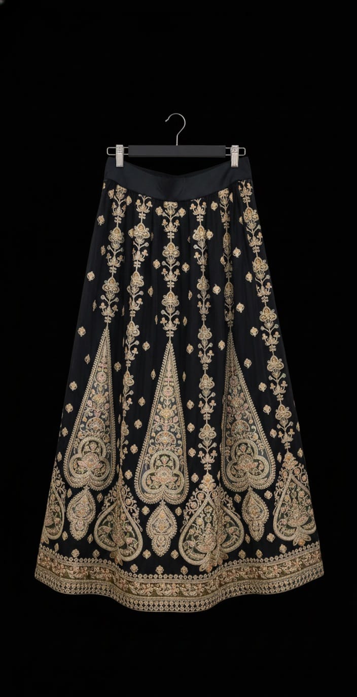Falda brocada en dos tonalidades, una en negra y otra en azul verdoso, el tejido es de seda, el cual esta bordado con hilo de oro. El dibujo de la falda es geométrico estilizado, que se extiende verticalmente.
