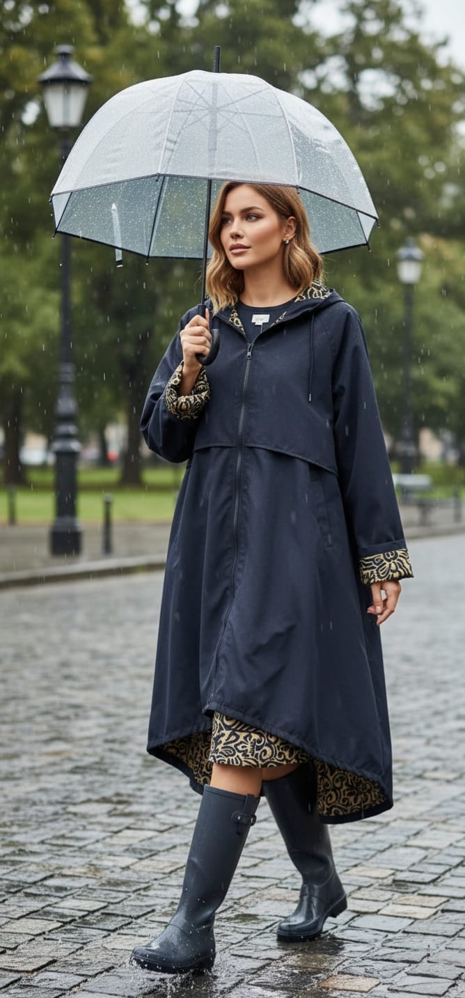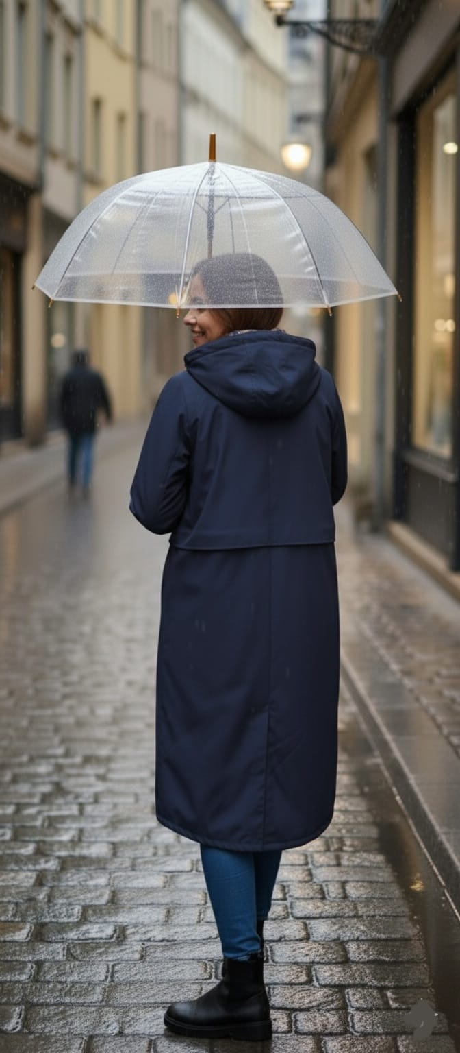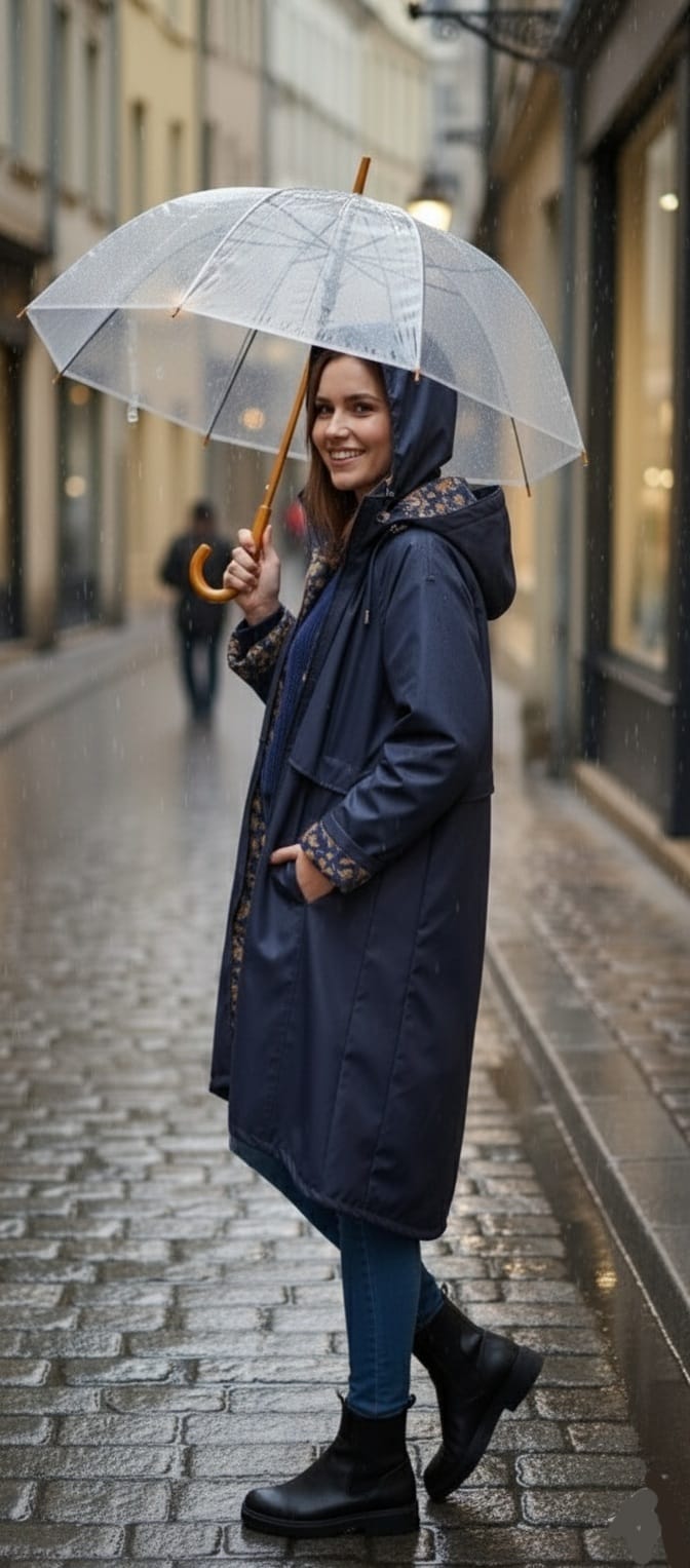 Abrigo impermeable con el forro interior de seda saree. Tiene cierre cremallera y con gorro. La parte trasera es más larga que la delantera dando forma de pingüino. Este abrigo tiene unas tablas tanto en la parte delantera como en la parte trasera, versátil tanto para mujeres con caderas mas anchitas como para las mas delgaditas.